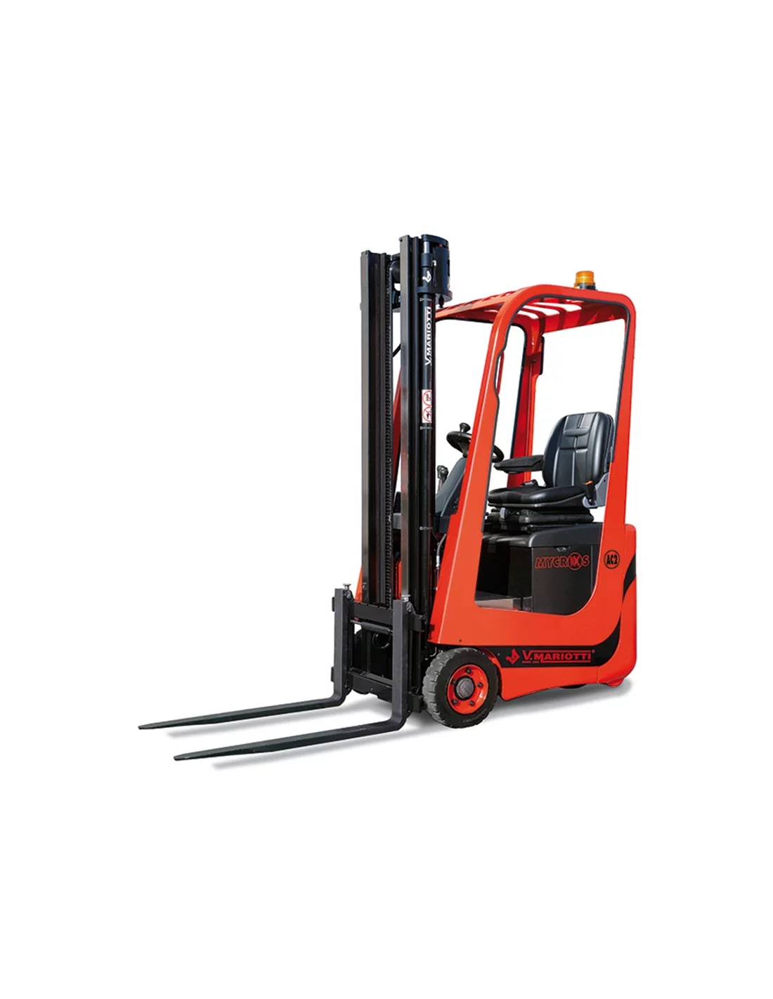 These are three concepts that are closely linked and extremely important when it comes to a modern truck. They are also the reason that the Mycros range is a market leader. Despite being the most compact truck in its category, it offers to the operator a great deal of space which guarantees high standards of comfort and ergonomics. Mycros comes with an adjustable steering wheel, a very comfortable suspension seat with 3 adjustable positions and an armrest that is also adjustable, all fitted as standard. All the controls are within easy reach, from the robust directional switch to the levers for the hydraulic distributor. The cabin is rounded off with a handy storage tray and a practical bottle holder. The entire range has two drive modes: rabbit and turtle. Turtle does not just include a reduction of speed, but also a reduction of acceleration and braking with energy recovery. This mode enables to drive in tight spaces and to great lifting heights. Mycros is fitted with rear safety LED lights, as standard, which are clearly visible while maneuvering.