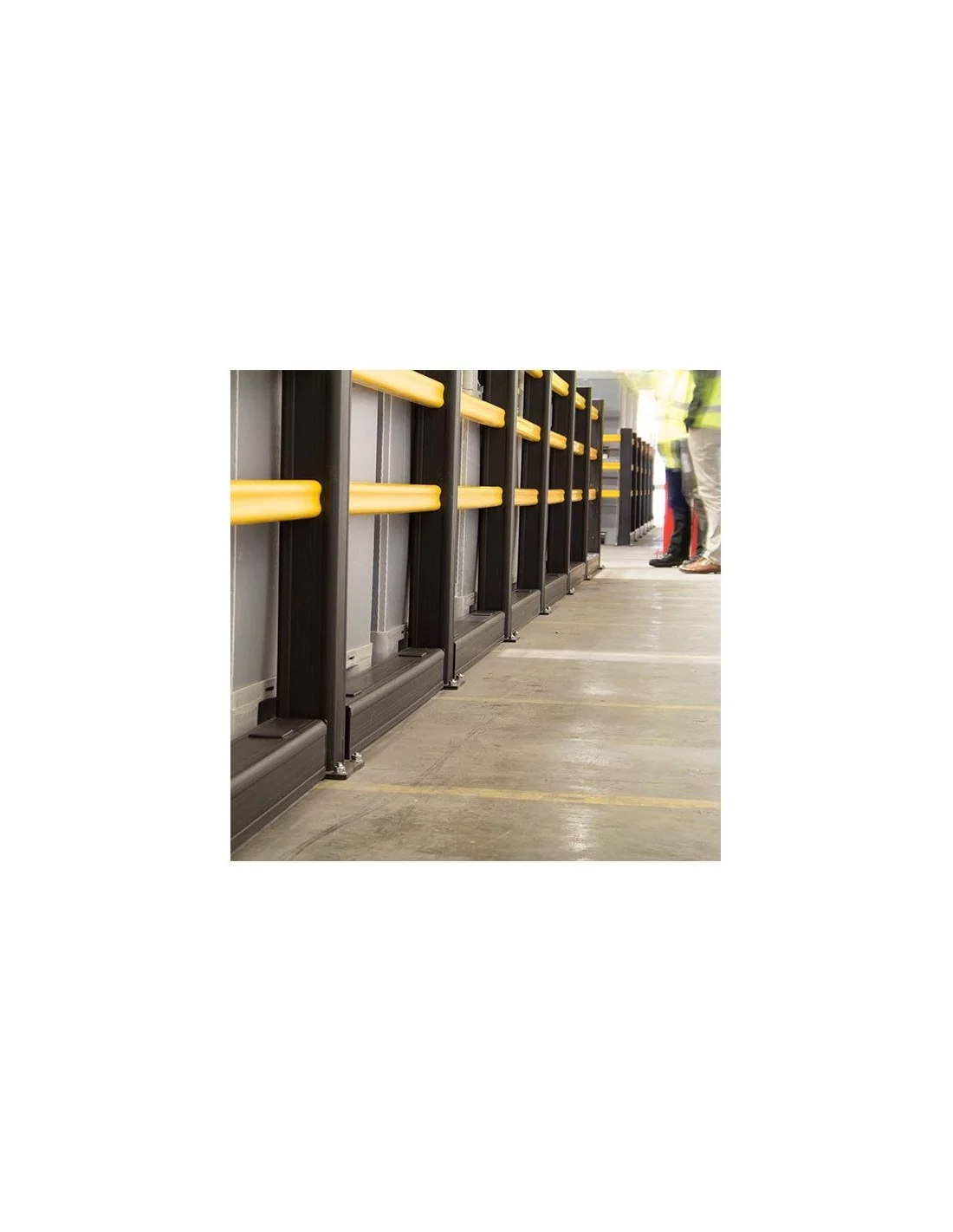 A wheel guide or wheel stops perfectly adapted to pallet trucks. Typically used to protect baseboards and walls from pallet truck impacts in high-traffic areas such as warehouses, parking lots and sheds.