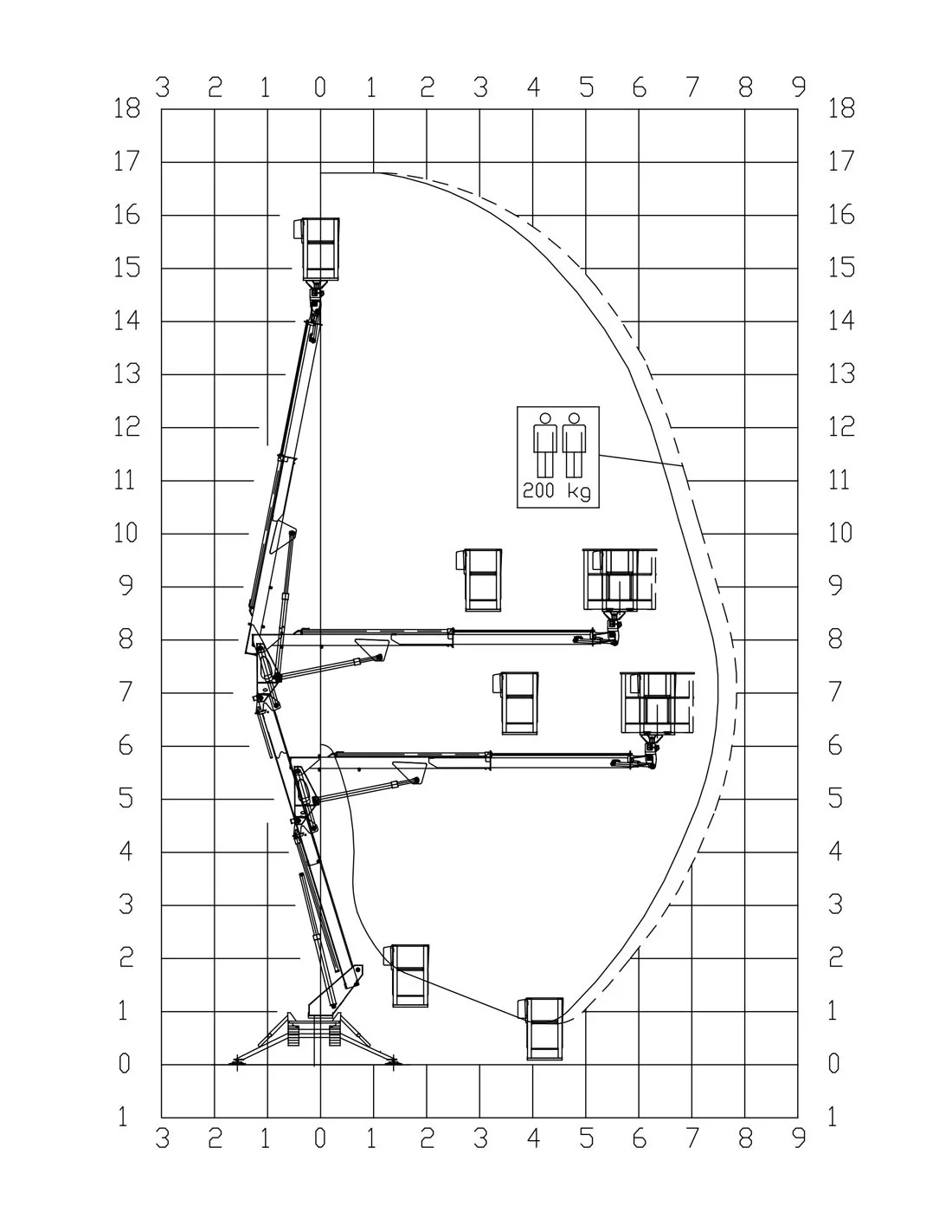 Basket made of aluminum with a minimum capacity of 120 kg and a maximum of 230 kg, with standard dimensions of 140x70x110 cm fastened to the arm by quick coupling, easily dismantled when needed for narrow passages. Fixed control panel on the basket for all aerial maneuvers. 230V electrical outlet in the basket to use tools during the aerial work.