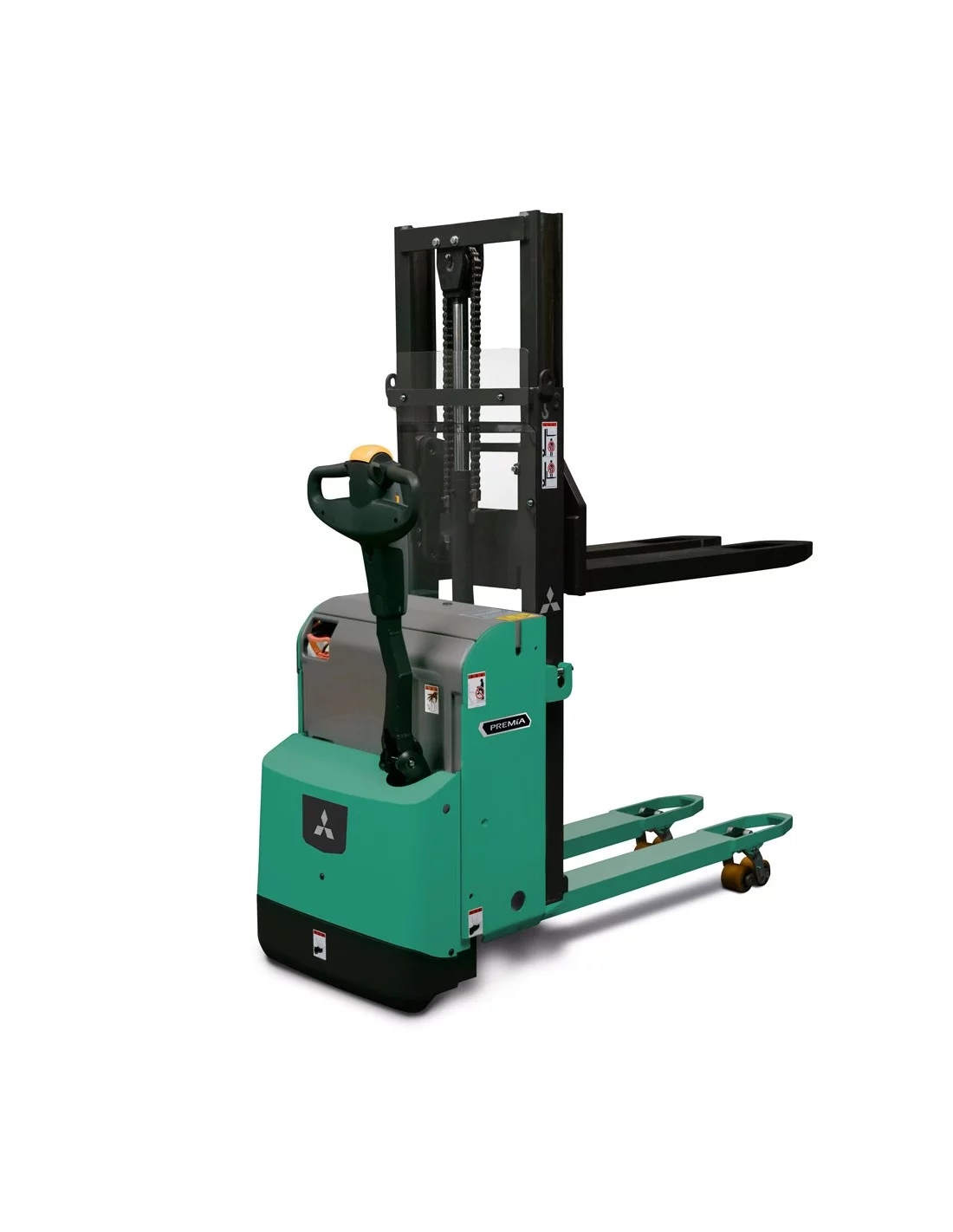 The narrow (only 660 mm wide), short and round edged chassis allows the operator to pick up and position pallets in confined spaces. The rounded edges also minimise the risk of damaged goods, while the low bumper on the short chassis prevents foot injuries. For even better space utilisation, there's the option of Tiller-Up drive. When carrying the Mitsubishi PREMiA ES (PBP16PD) with you on a lorry it will only take up half a pallet space thanks to its compact design.