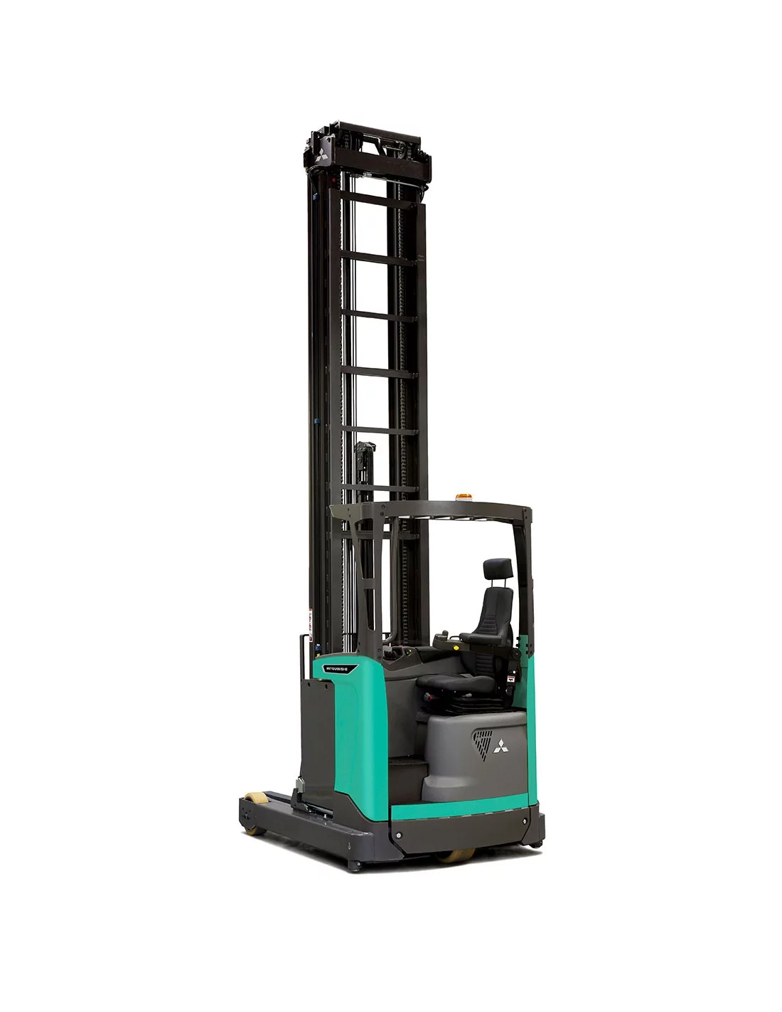 Le chariot à mât rétractable Mitsubishi RB20N3HX pour manutention lourde a été spécialement conçu pour les applications double profondeur et peut aussi être doté de fourches télescopiques.